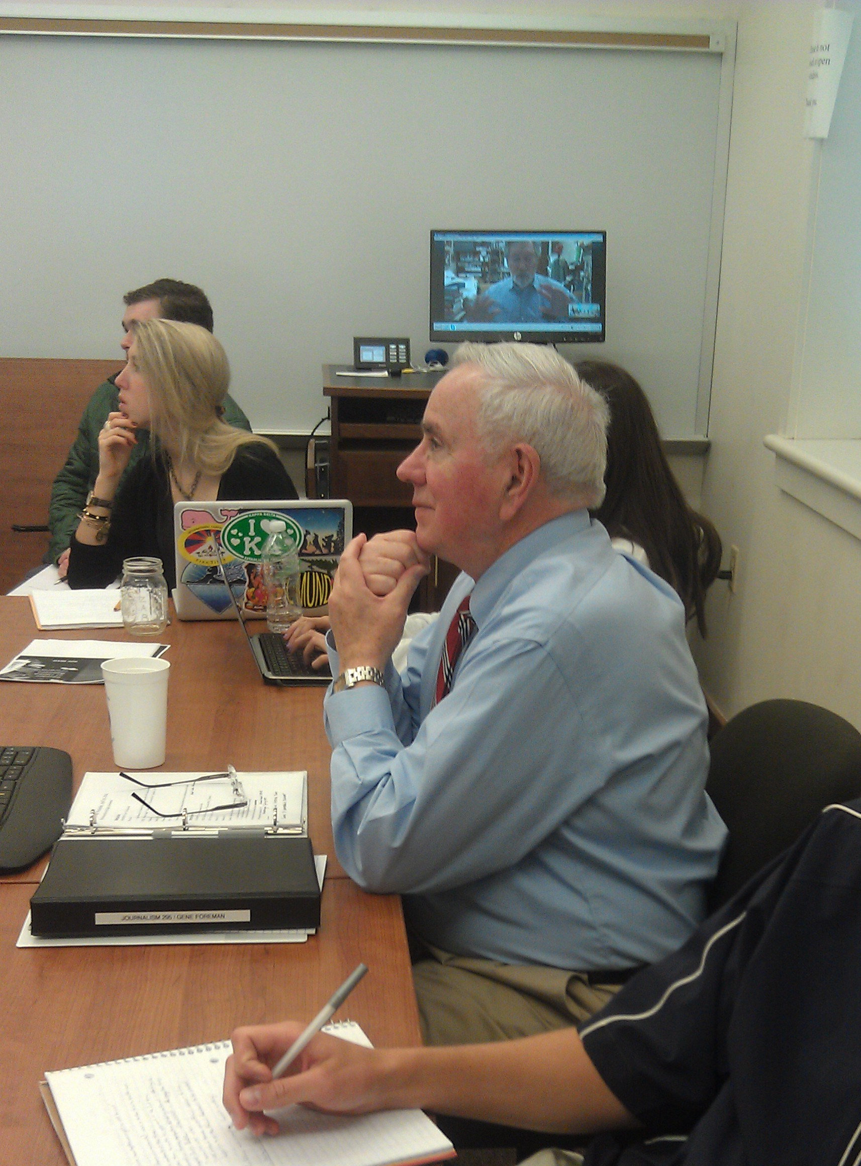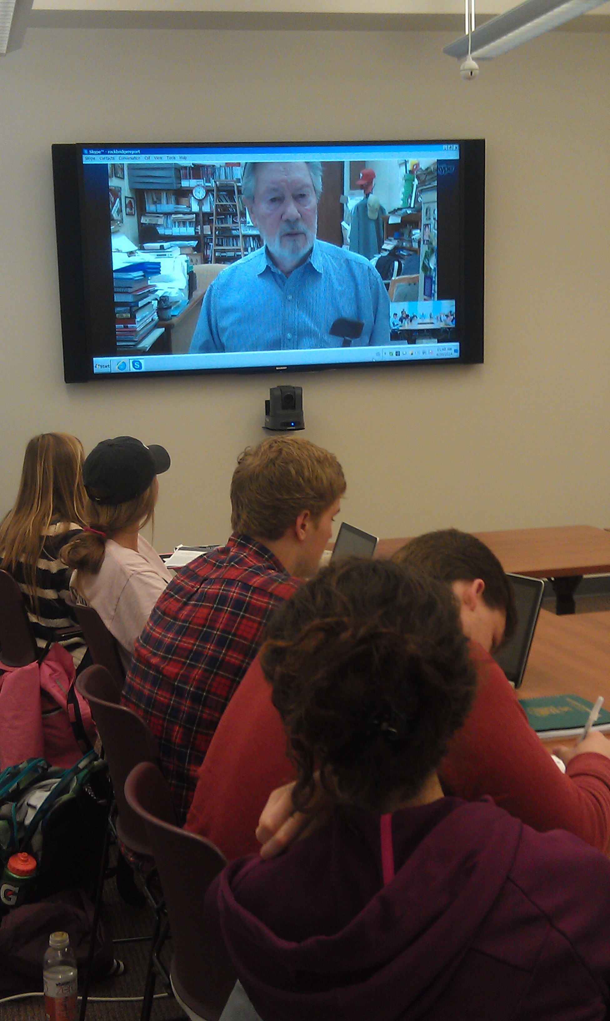Gene Foreman, former Philadelphia Inquirer m.e., Skype-ing with former NYTimes reporter Roy Reed (on monitor in the background)