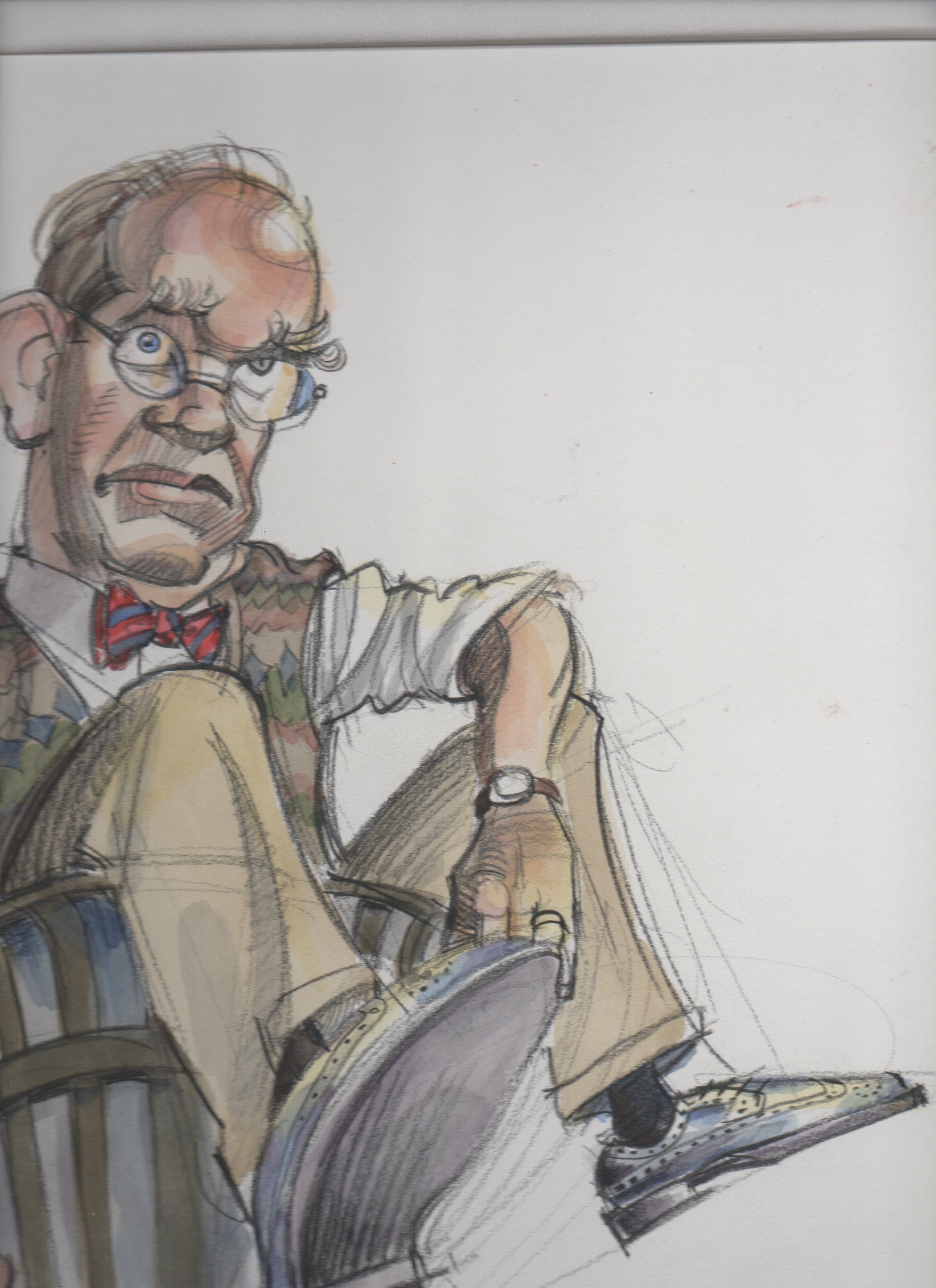 I know the one – I have the original: I posed as a model for the illustration he did for a Journal-Constitution feature story on older executives who get laid off in favor of younger, lower-paid professionals. The illustration had this old man, balding, bow-tied, and butt-folded into a trashcan. Walter is a genius at capturing the surface reality.