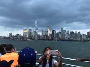 The two-hour tour circled around the great island of file-cabinet skyscrapers, chugged under the cable-knit East River bridges to Roosevelt Island, and muscled out to a vantage point between the Statue of Liberty and dense-packed lower Manhattan as both lit up. The glow brought a hundred cellphone cameras aloft, offering a perfect contrast to the blue-gray waters below and clouds above the color of a large bruise.