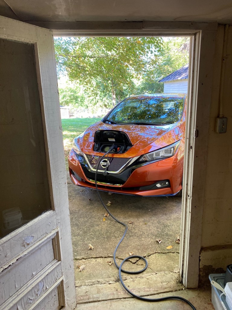 I drove our new Nissan Leaf from Georgia (where I bought it) to Lexington in October. I used four charging stations (each location benefiting from my hanging around and spending money, something Lexington could use as a well-located charming tourist town). But once I got home, I discovered that the house I rent has wiring too old to charge the Leaf. I searched for days for a charging station. Two local hotels restrict theirs to guests. A half dozen Tesla charging stations are not compatible (and Tesla’s promise to make an adapter remains unfulfilled). Eventually, I found a Level 2 (220 AC) charging station at a Walmart in an adjacent county — wasting the time and money that EVs should be saving an owner.