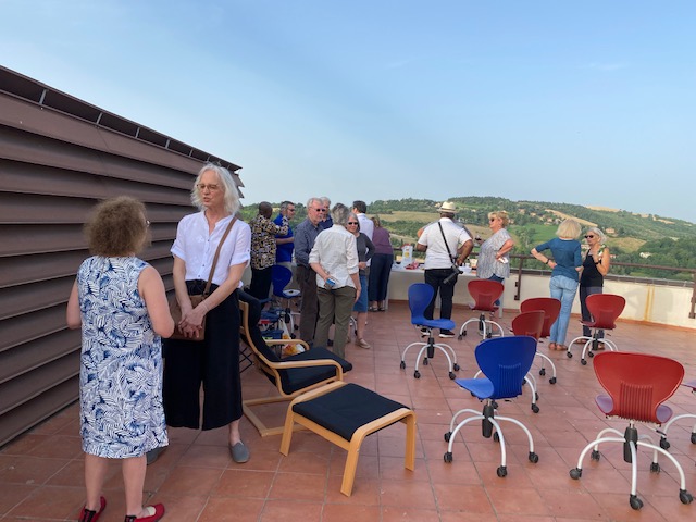 I have been out on the empty terrace at dawn, pretending I know yoga but really just there to watch for the swifts. There are a lot more of them at dusk, when the ieiMedia faculty family gathers, furnishing the terrace with chairs, tables and a feast of local foods and wine.