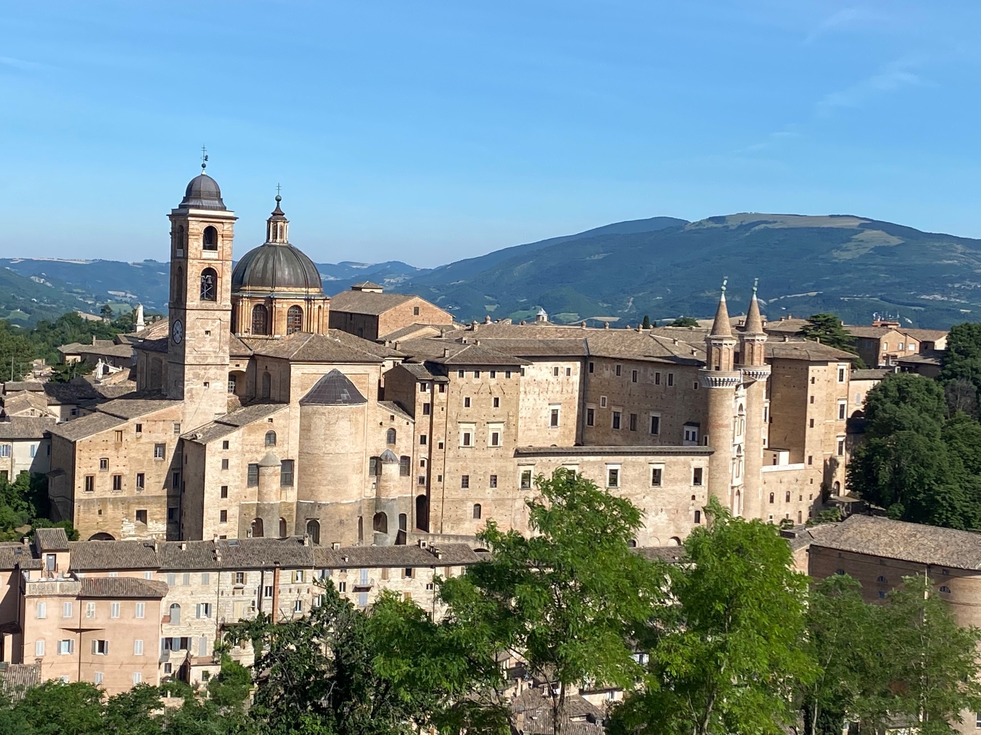 Out on the red-tiled terrace off the top floor of our Collegio Internazionale, there are many miracles. In one direction, the pride of Urbino – a bell tower that can surprise with alleluias through the old brick alleyways, and behind that, the glory of the Duomo. In the other direction, nature’s plotted palette of slant fields, flowers and row trees, backed by the two mountains framing Furlo Gorge.