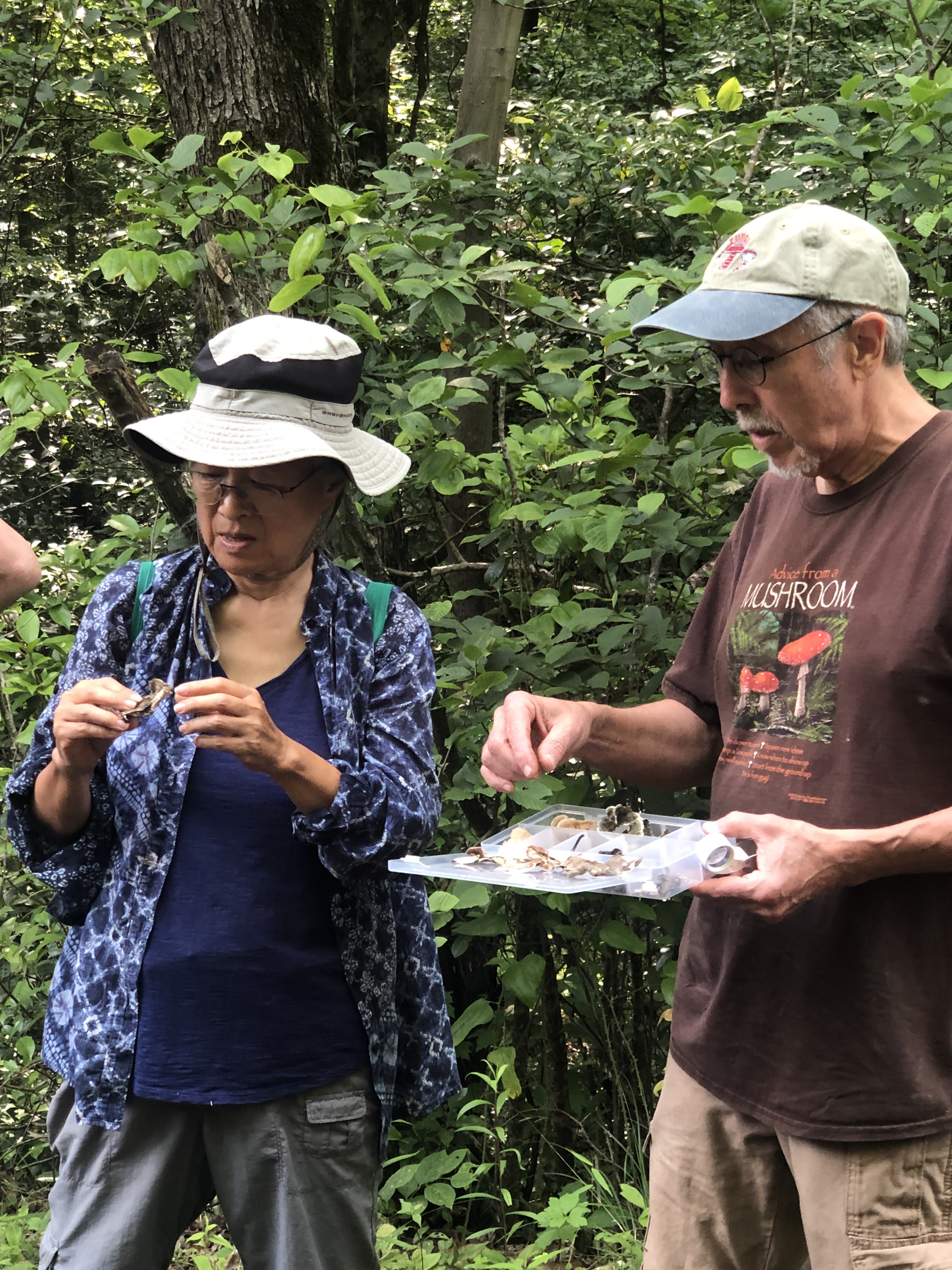 The 2 ½ hour hike would cover about a half mile up the abandoned Drunken Spring Road and Corn Hill Knob trail, since that was the wetter choice, three days after the last rain. He and his wife, a pediatrician and researcher in economic botany named Cornelia Cho, were leading. They had come to this North Georgia mountain in a car with the license plate of “FUNGI” and Sam wearing a pro-mushroom t-shirt and bearing a basket with a plastic container for about two dozen specimens and two magnifying loops.