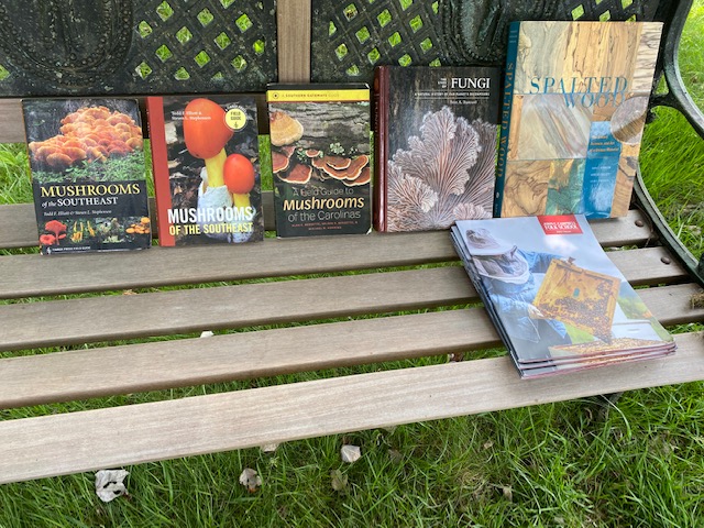 Our fungi hike also included four rambunctious dogs who got up to their dew claws in mud. After the hike, we gathered for a sweet picnic in a maple’s shade, piling goodies on bagel slices downed with bubbly. Sam didn’t give the summing up lecture I was hoping for, but he had spread five beautiful books on the old golf links bench – The Lives of Fungi: A Natural History of Our Planet’s Decomposers, Bunyard; A Field Guide to Mushrooms of the Carolinas, Bessette, et al; Mushrooms of the Southeast, Todd Elliott et al; Spalted Wood, on the lovely blue-green wood of the fruited Emerald elf cup (chlorociboria aerugiosa), and catalogues to the Campbell Folk School. And he did answer questions while I took notes.