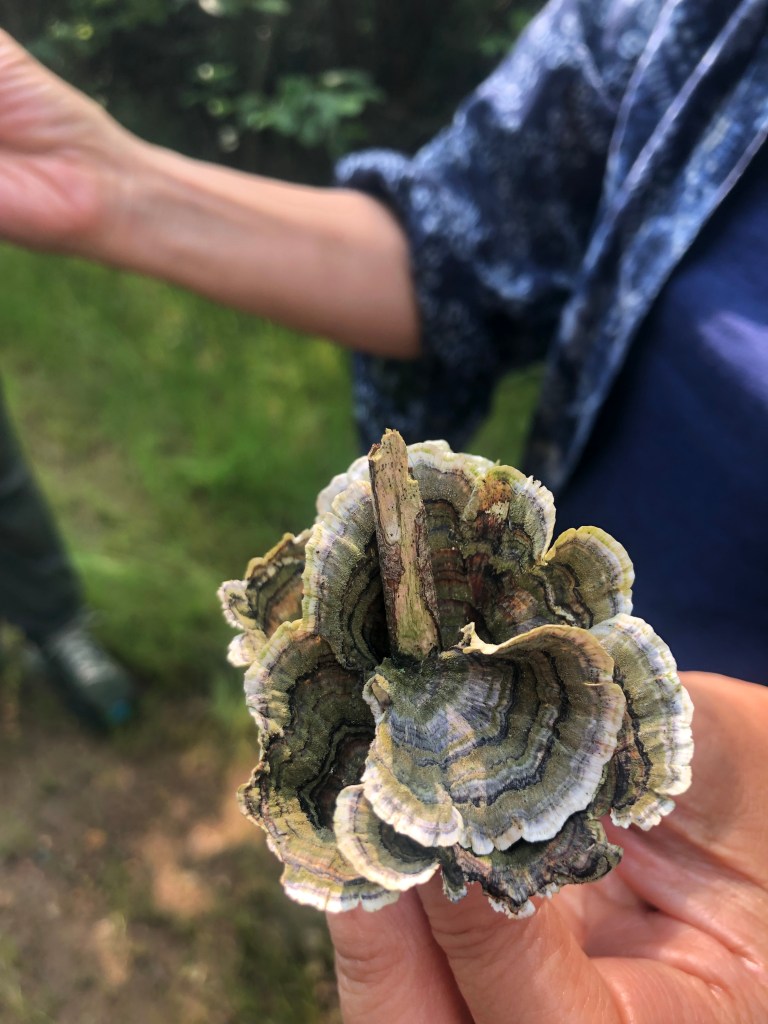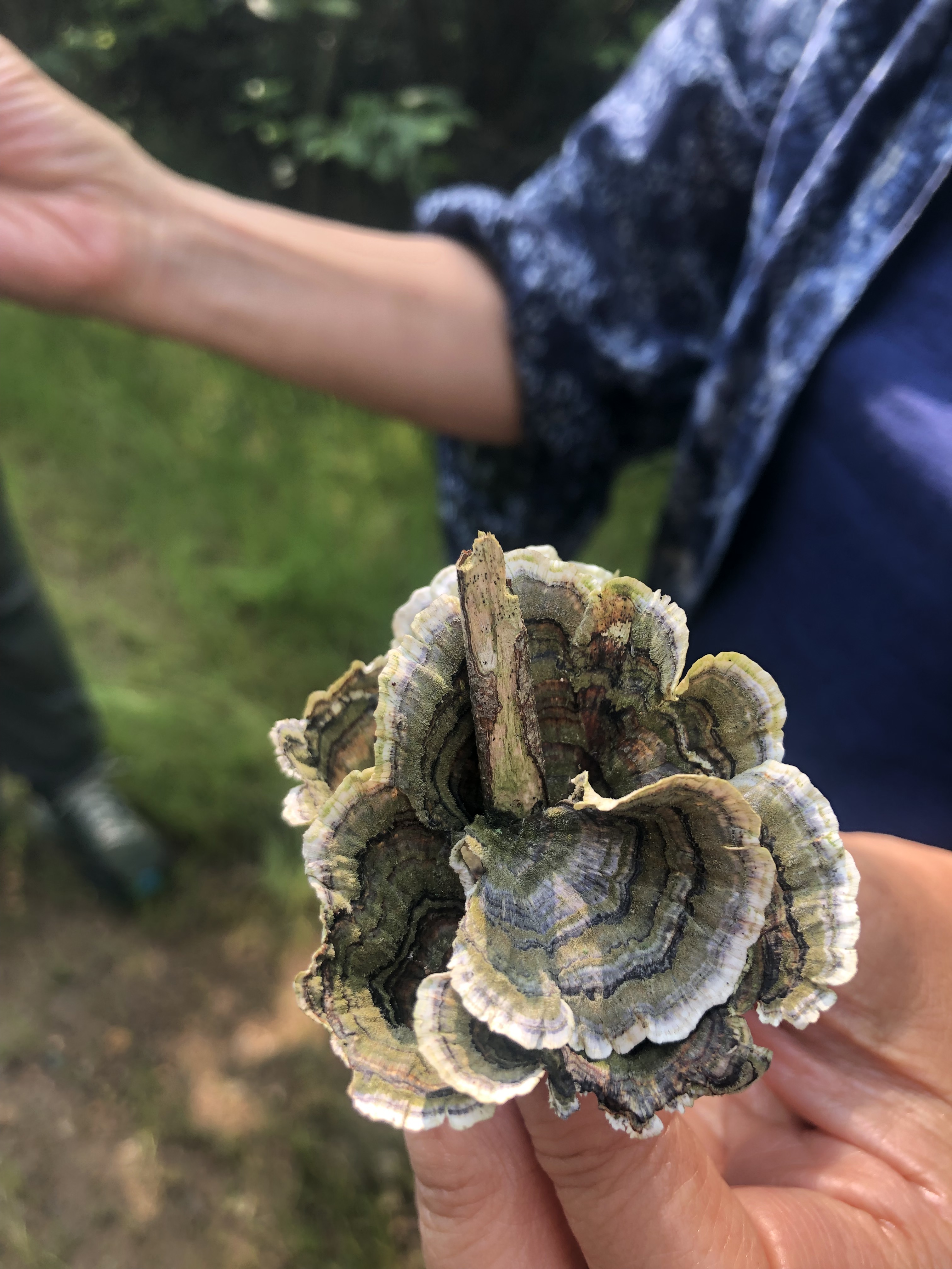 Too many kinds of fungi fill the woods for our decomposing brains. But there was something exciting about the knowledge Sam and Cornelia were wasting on us. They spoke Latin names of genus and species of Russula, morels and Amanita, naming parts too small to see without a loop: gills, spores, and the tiny pin holes on the underside of the polypores. They told hopeful stories of natural medicinal values, like the extract from the true Turkey Tail (pictured above) that can boost the immune system against certain cancers, and the spit poultice from the common plantain weed that once stanched swelling when Cornelia was stung in her hand by a few yellow-jackets, she told us. Sam would vanish into dark bracken grottoes to find the tiny red pimples called Wolf’s Milk or a slime mold (not a fungi but a mycoparasite, not to be confused with mold in your house). He would explain the morphology of what you see on the ground or on rotting logs, and what you don’t see, the vast networks of mycelia that communicate and transact energy with “mother trees” in ways that make the science of it sound mystical. Or at least Lamarkian.